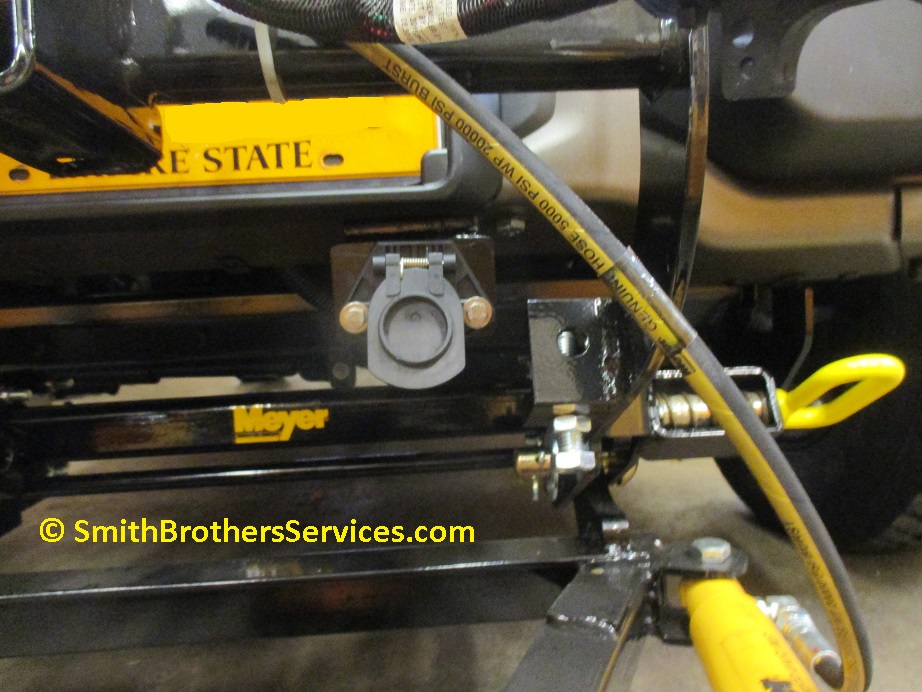 Like magic the mount and wiring are done. The Meyer decal is something we add to the Clevis on all of our Drive Pro installs. Not sure why Meyer does not put one on it, so we do. The 1 piece plug is mounted on the same custom bracket we make for all the Jeep Wrangler JK's we install the Meyer Drive Pro 6' 8" plows on.