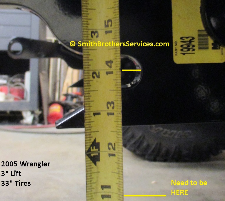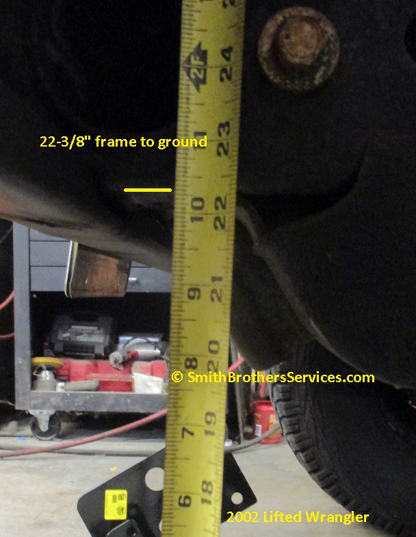 Well here we go. This Jeep has a 3" lift, and 33" tires, but the bottom of the frame measures 22-3/8" to the ground, unlike the 2005 before it, that measured 24" to the ground.