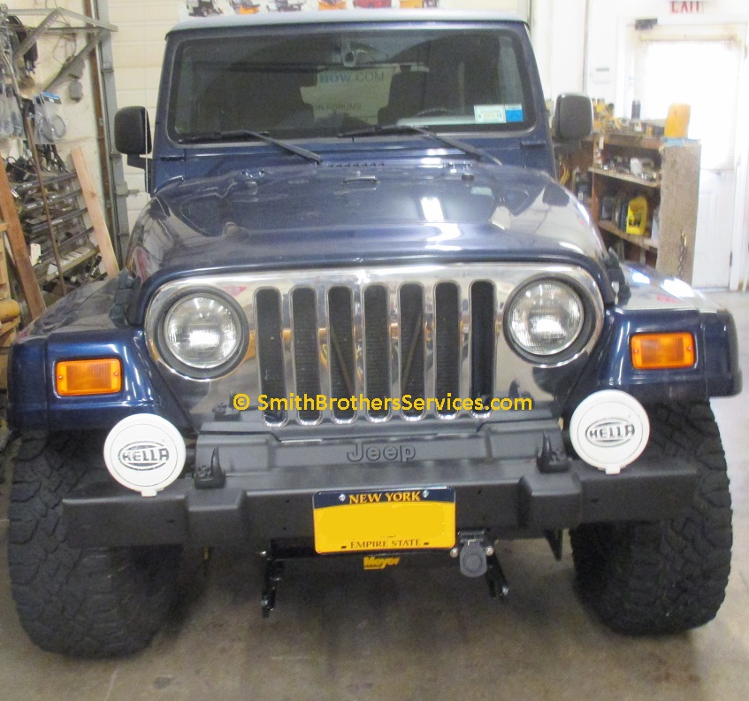 In the fall of 2016, I had a customer contact me from upstate NY looking to have a plow installed on a lifted 2005 Jeep Wrangler TJ. They called all the local dealers, and none would install a plow on a lifted Jeep. I knew how to make it work with minimal modifications, so I agreed to sell them a plow and install it. When it was here for the install, I had another customer come in with a lifted 2000 Jeep Wrangler TJ, same lift, same size tires, who would need the same modifications. I agreed to do the install. The next day (you cannot make this up!) yet antoher customer walked in who just bought a lifted 2002 Jeep Wrangler TJ, and wanted to mount a plow on it. The owner of the 2000 and the 2002 bought the Jeeps and used plows separately, and had no idea it was not a direct install with no problems. The following pictures show what had to be done to each, and why all lifts and tires are not equal. ALL three Jeep Wrangler TJ's supposedly had a 3" lift with 33" tires.
