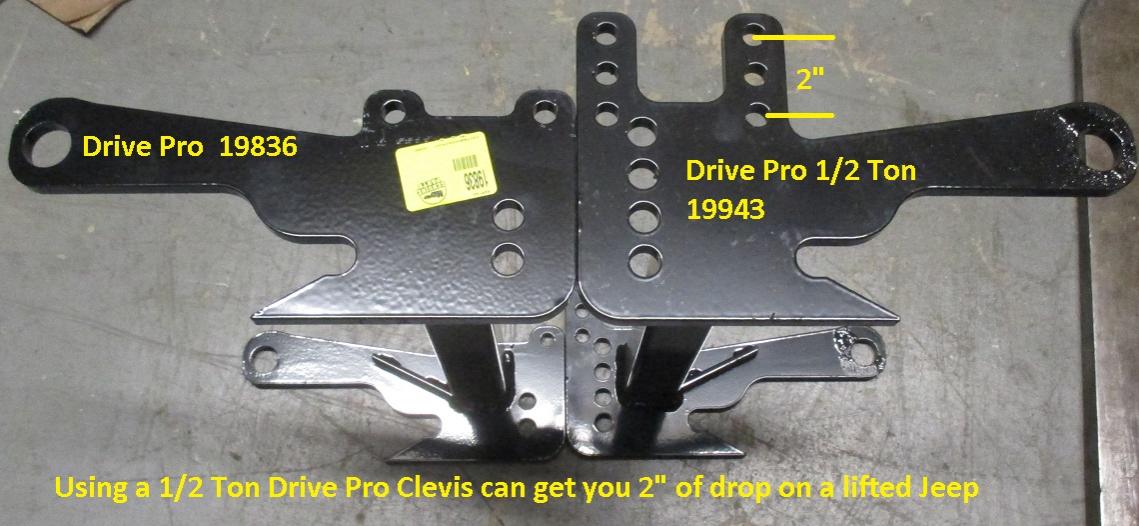 To start, and most don't think about this, I knew I could gain about 2" of drop in the Universal Clevis on the Jeep to help compensate for the lift, IF I used a 1/2 Ton Universal Clevis. The 19943 1/2 Ton Clevis is what we use on half ton trucks to run a Drive Pro Single Pull 7.5 plow. It is a taller Clevis to allow (what you would expect to be) for the taller ride height of the 1/2 Ton versus a Jeep Wrangler, or other small vehicle, to attain what Meyer thinks the Clevis height should be. I don't like to contradict Meyer, but their clevis height is wrong. It is too low.