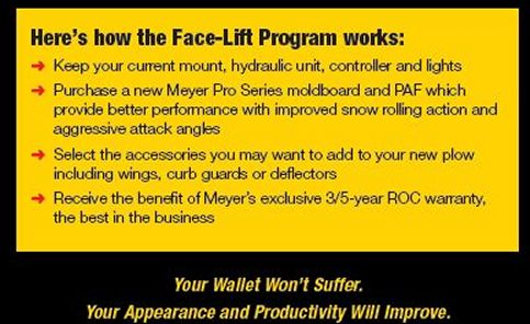 Meyer knows our owners take pride in the appearance of their snowplowing vehicles, but we also know times are tough and purchasing a new plow might be a strain on your budget. Thanks to Meyer's innovative new plow designs, it is now easy and affordable to upgrade from a Classic Meyer Plow to an all-new Meyer Pro Series moldboard for about Half the Price of a NEW complete plow system.