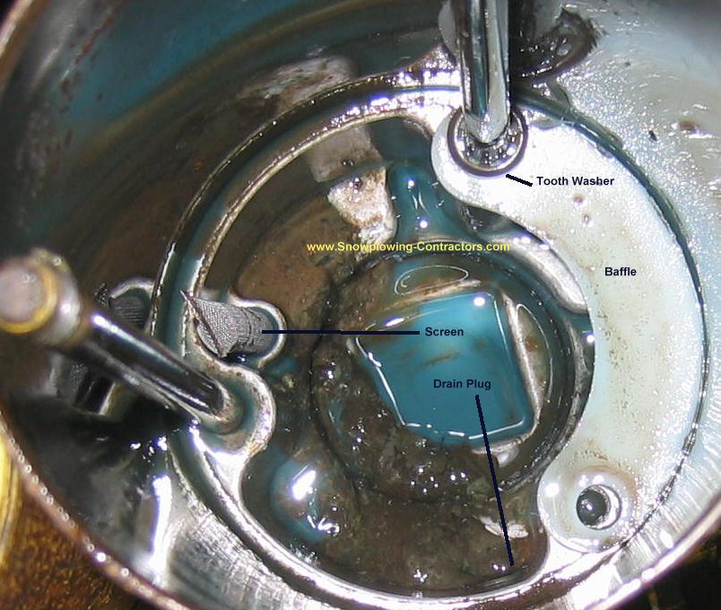 (Note: The Fluid Tank has not been removed yet.) Now you can see how much gunk is in this unit. You can see the milky blue fluid. You can see the plastic Baffle that is held in by the tooth washers on two of the studs. You can see the pump Suction Screen. You can see the Drain Plug, and how simply draining the pump did not remove any of the gunk.