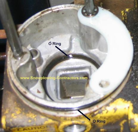 Most of the gunk has been removed with Non-Chlorinated Solvent. You can see the O Ring that seals the base of the Lift Cylinder. The Suction Strainer has been removed. You can see how deep the Sump Base is too.
