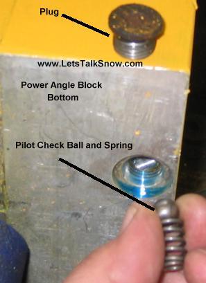 We then reposition the unit in the vise so we can access the bottom of the Power Angle Block to install the Pilot Check Ball, Spring, and Plug. This must be done prior to installing the Pilot Check Piston and Plug on the top of the Power Angle Valve Block.