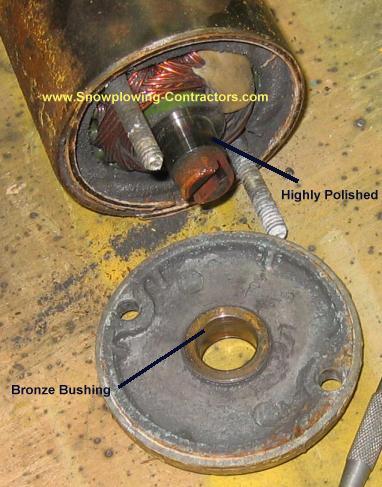 The highly polished part of the shaft rides on the bronze bushing. The motor has no bearings, only bronze bushings. Be careful when cleaning this, as bronze is porous, and you don't want to degrease it. In fact after cleaning it with solvent on a rag, you should let the end cap soak in light motor oil over night, so the bronze can soak up more oil.
