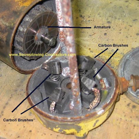 Here the Motor Top Cap has been removed, and you can see the Carbon Brushes, and the motor Armature. You can tell by the heavy corrosion on the motor screws that moisture was getting into the motor.
