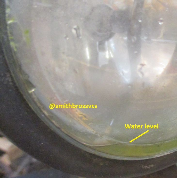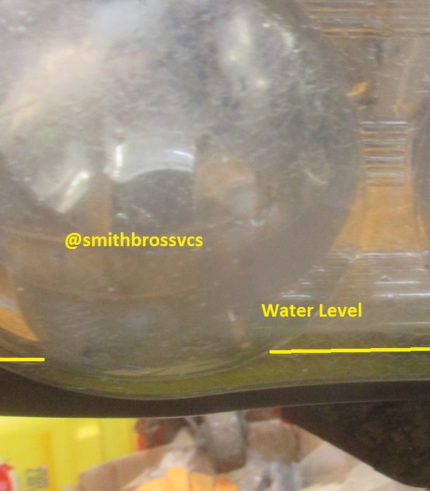 For whatever reason this plow was stored with the crankstand up as far as it would go. That makes the lights lean forward. The drain holes are in the center, bottom of the lights. Leaning forward, they can fill with water, and even grow algea like these did. I had to dissassemble, remove, rinse out with bleach and water to kill the algea, then put on a milk crate in front of a little heater for a couple of hours to dry out. Then reassemble. In the end, all the bulbs needed to be replaced.
