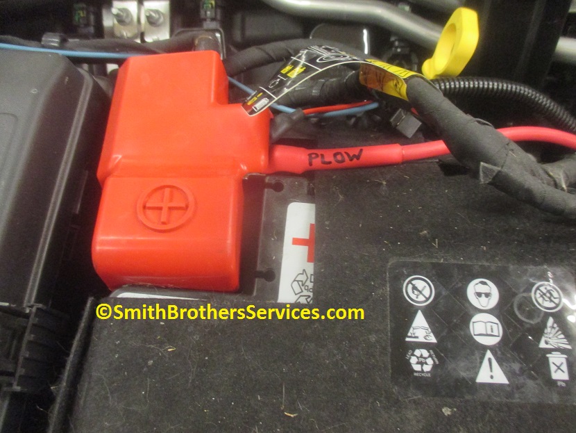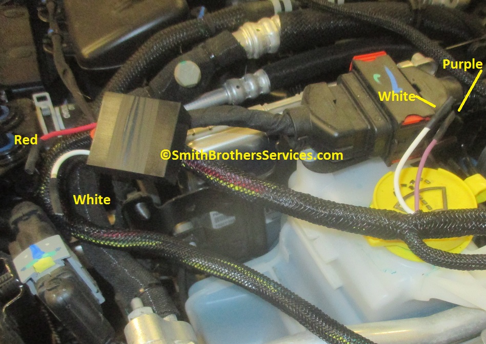 Moving on to the wiring. This is the truck side harness 23059. Coming out of the "box" on the left you see a red wire and a white wire that I blunt cut and sealed. The red wire would be connected to the vehicle high beam, and the white to the vehicle low beam. These if connected will not let the plow lights come on if the vehicle headlights are on. I do not connect it as we are not interfacing with the vehicle lighting circuit. It is easier to turn the vehicle lights down to parking lights only when the plow is on, than to find out the truck does not like a connection on the headlight circuit, PLUS you would have to cut and splice the headlight wiring. Moving to the right side we have a white wire and a purple wire that I also blunt cut and sealed. The white wire would go to the relay on a GM truck, and the purple wire goes to the purple with black stripe on 2019 & up Ram trucks. This purple wire tells the truck the plow lights are on and the truck turns the truck headlights off automatically leaving only parking lights on.