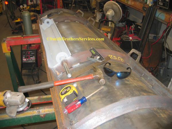 Here the frame is tack welded together. It is not welded to the skin. This is because we want to weld both sides of the frame rib ends to the top and base angles.