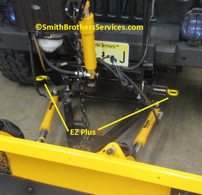 Test fit. All is well. Should have only made the ears 3.5" tall, but oh well. The edge will wear soon enough. Plus, when the plow is down, when the Jeep accelerates, the front end will rise slightly. Had to swap a 33" hose for a 39" hose on the passenger side.