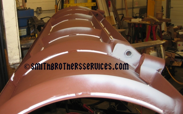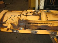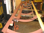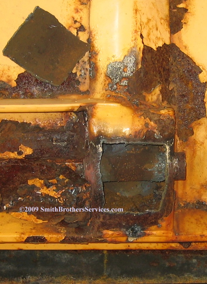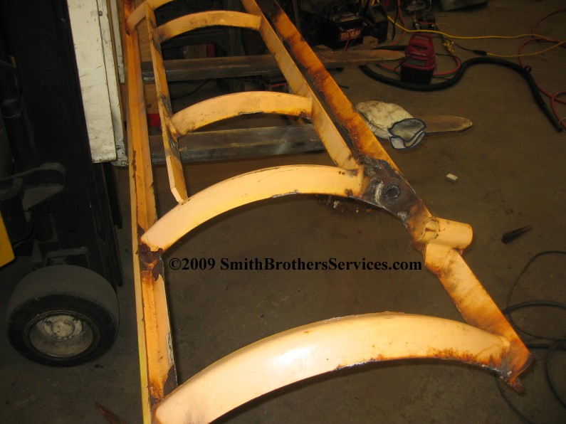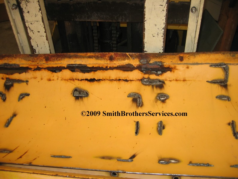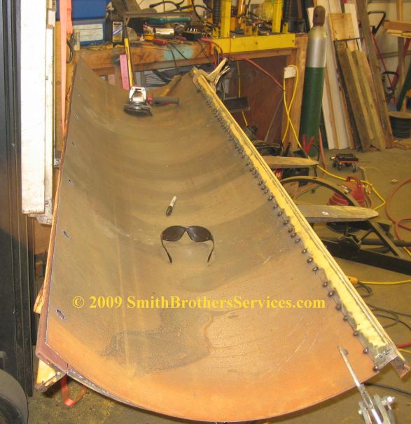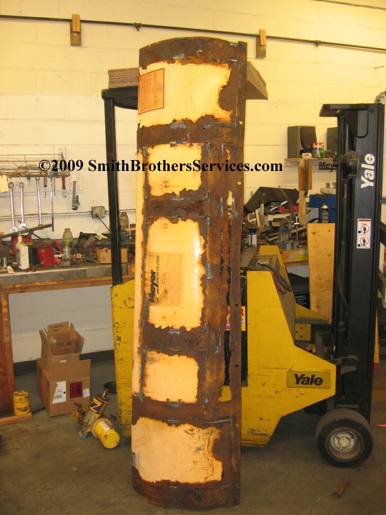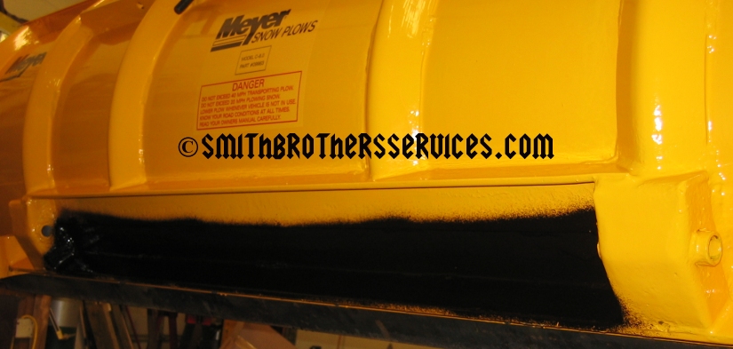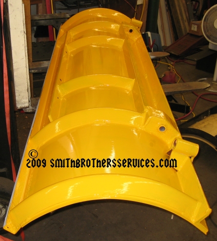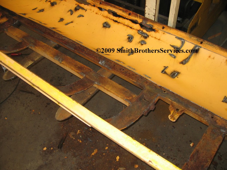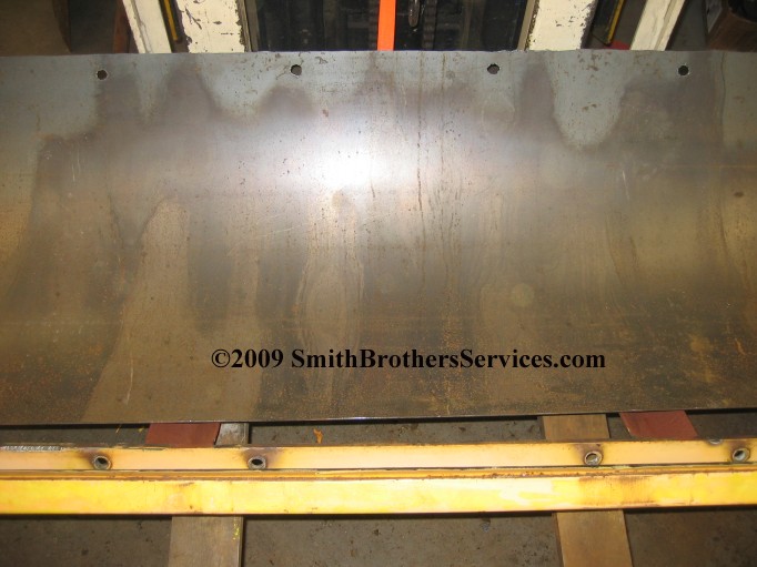 Faced with the rising cost of new plows, re-skinning your trusty rusty plow is a viable and often cost effective option. Not many (if any) Meyer Dealers will do it. We do. The skin is a piece of 11 gauge steel we have rolled by our steel supplier. Meyer does not sell steel skins. This plow is approximately 7 years old. The powder coat has exceeded it's lifespan, and is just promoting more rust. This plow was often stored face down on the ground. You can click on any image for a larger version.