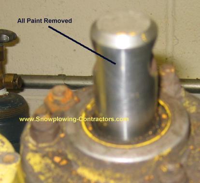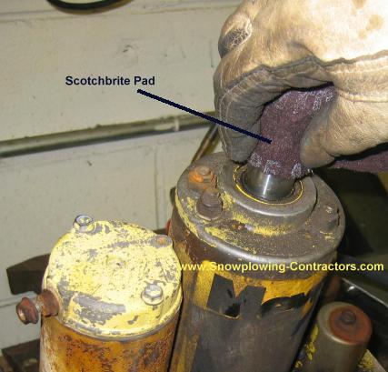 We begin the process by cleaning all the paint off the lift ram using a 3M Scotchbrite pad. The ram must be clean to allow the top cap of the reservoir to be removed. Any burrs around the hole where it was bolted to the lift arm must also be carefully filed down.