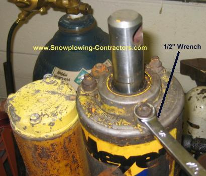 Next we remove the nuts on the studs that hold the top cap on. We use a 1/2" wrench for this. It is not uncommon for the studs to unscrew instead of the nylock nuts. It is OK if that happens. If it does, do not try to pull the studs completely out after loosening, you will see why in the next pics.