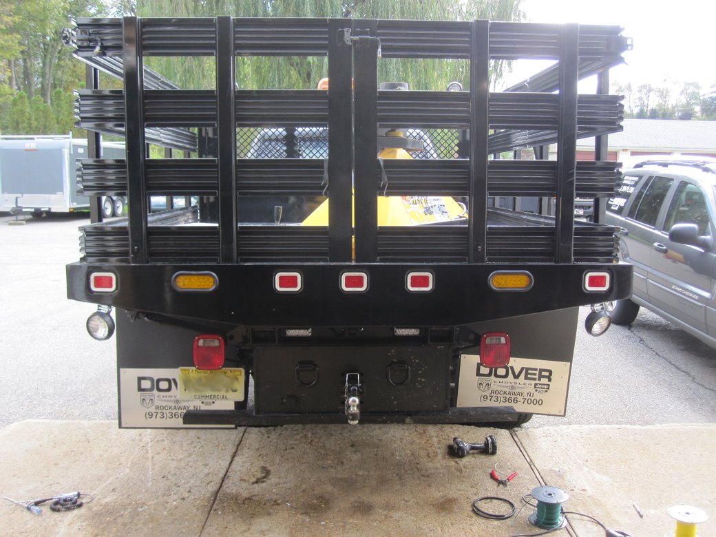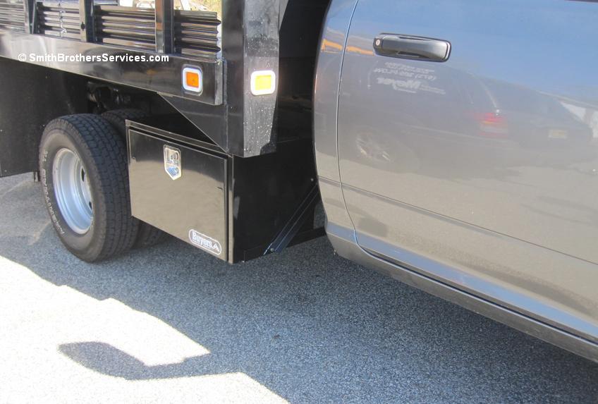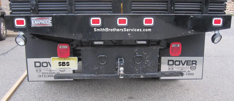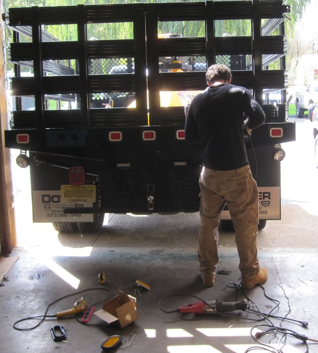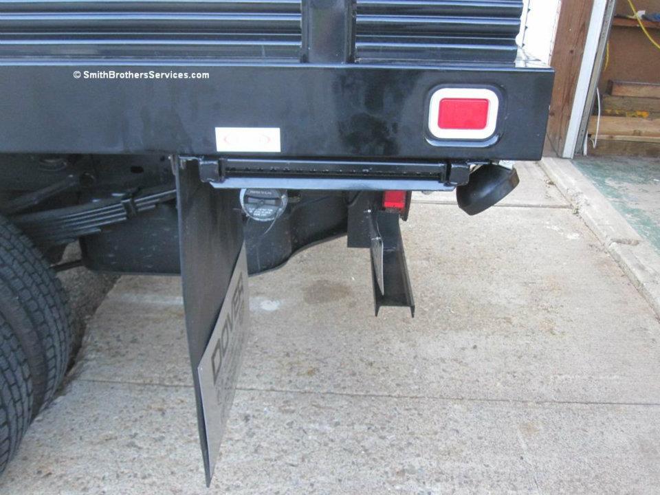 Then he mentioned he wanted nerf bars / steps to make getting in a little easier. The original pintle hitch would not allow him to use his tailgate salt spreader, and the height of the hitch was not adjustable, so we removed it and installed a receiver hitch rated at 20,000 pounds trailer weight, and 2000 pound tongue weight. We also installed a trailer brake controller, and removed the dealer signs from the mud flaps and installed a set of signs he had made for his company.