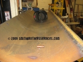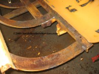 Faced with the rising cost of new plows, re-skinning your trusty rusty plow is a viable and often cost effective option. Not many (if any) Meyer Dealers will do it. We do. The skin is a piece of 11 gauge steel we have rolled by our steel supplier. Meyer does not sell steel skins. This plow is approximately 7 years old. The powder coat has exceeded it's lifespan, and is just promoting more rust. This plow was often stored face down on the ground. You can click on any image for a larger version.