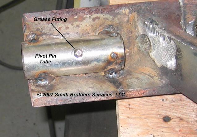 Here the left side has been tack welded into place. You can also see we added a grease fitting here. Hopefully keeping the pins greased will prevent them from seizing in the future.