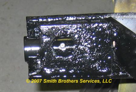 Here the new angle stop is welded into place, with a hole cut out for access to the grease fitting.