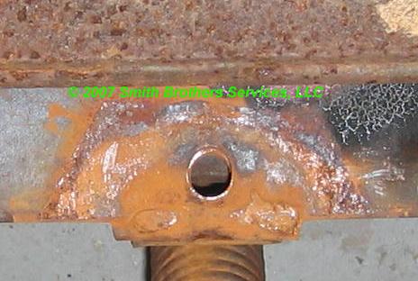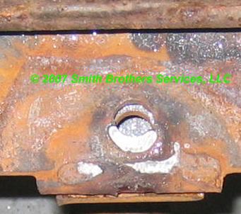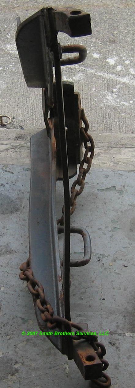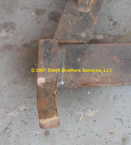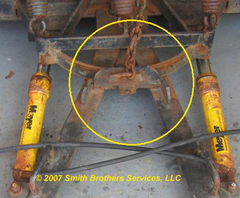 The left mounting ear was twisted badly. This happens when you lose a mounting pin while plowing. In this case, an operator lost the right mounting pin, and it appears that the plow dropped down on the right side, and went as far as it could under the truck.