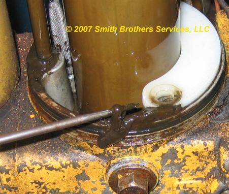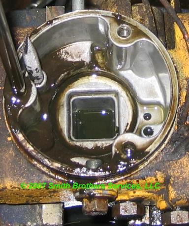 Upon inspection of the pump we found an "oil pan drain plug" in the unit. Most likely it was stripped due to overtightening at one time, and a heli-coil inserted.