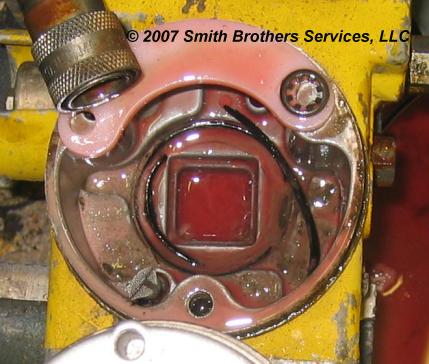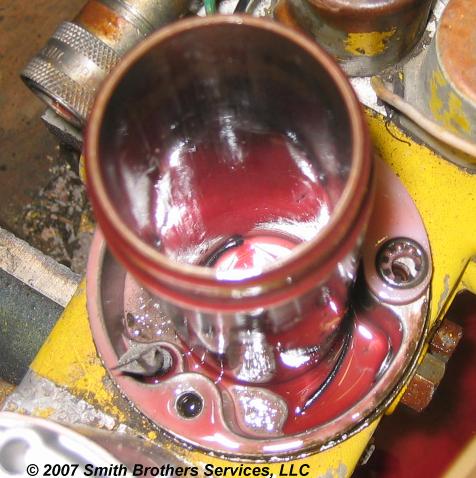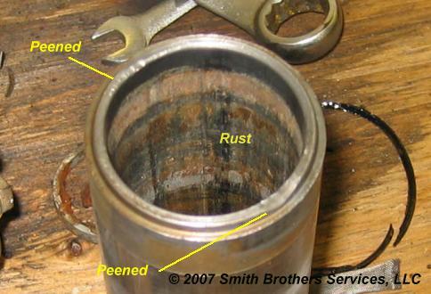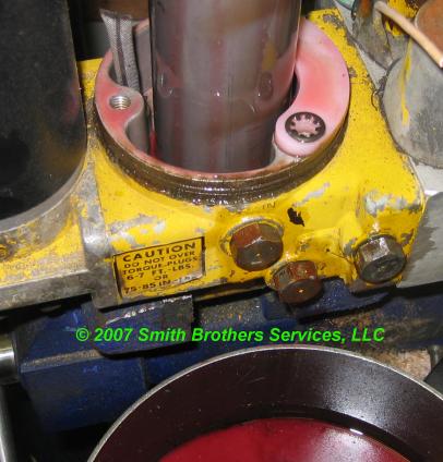 This is the bottom of the Lift Cylinder. There were two spots that were peened over interfering with the lift. When the piston was fully retracted (all the way down) it would stick there. Now we know why. We still have no idea why it would be necessary to peen or hit the lift cylinder with a hammer??? There was also quite a bit of rust in the cylinder that we honed off. We hand filed the peened areas to allow proper operation. The customer did not want to replace the lift cylinder.