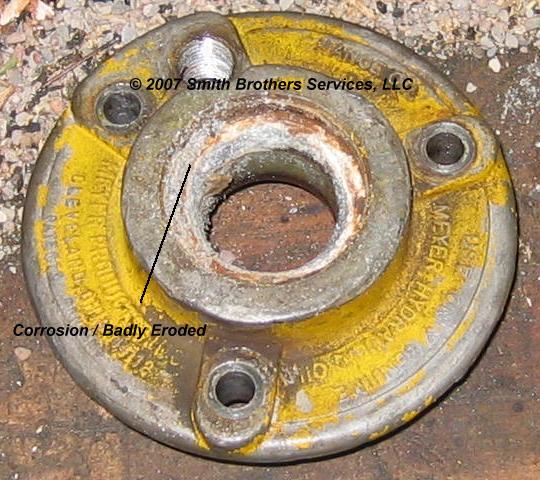 Another customer that bought a used pump and brought it in for service. He just had the motor replaced at a local electric motor shop. The first thing we noticed is that they did not put any silicone sealant on the heads of the two motor screws. This can allow moisture to get in the motor. We also noticed that somebody had the top cap off the unit at one time, and did not use the Nylite washers under the 3 nuts. This allows moisture into the reservoir. When we got the pump in the vise, this is what we found. (Not pictured is the missing seal on the top of the lift cylinder. No wonder there was water in the pump.)